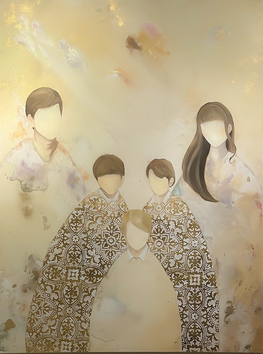 By merging elements of personal history with cultural design, the piece tells a story of identity, memory, and the blending of past and present. The absence of facial features allows the viewer to focus on the emotions and cultural influences embedded in the work, creating a universal reflection on self and heritage.