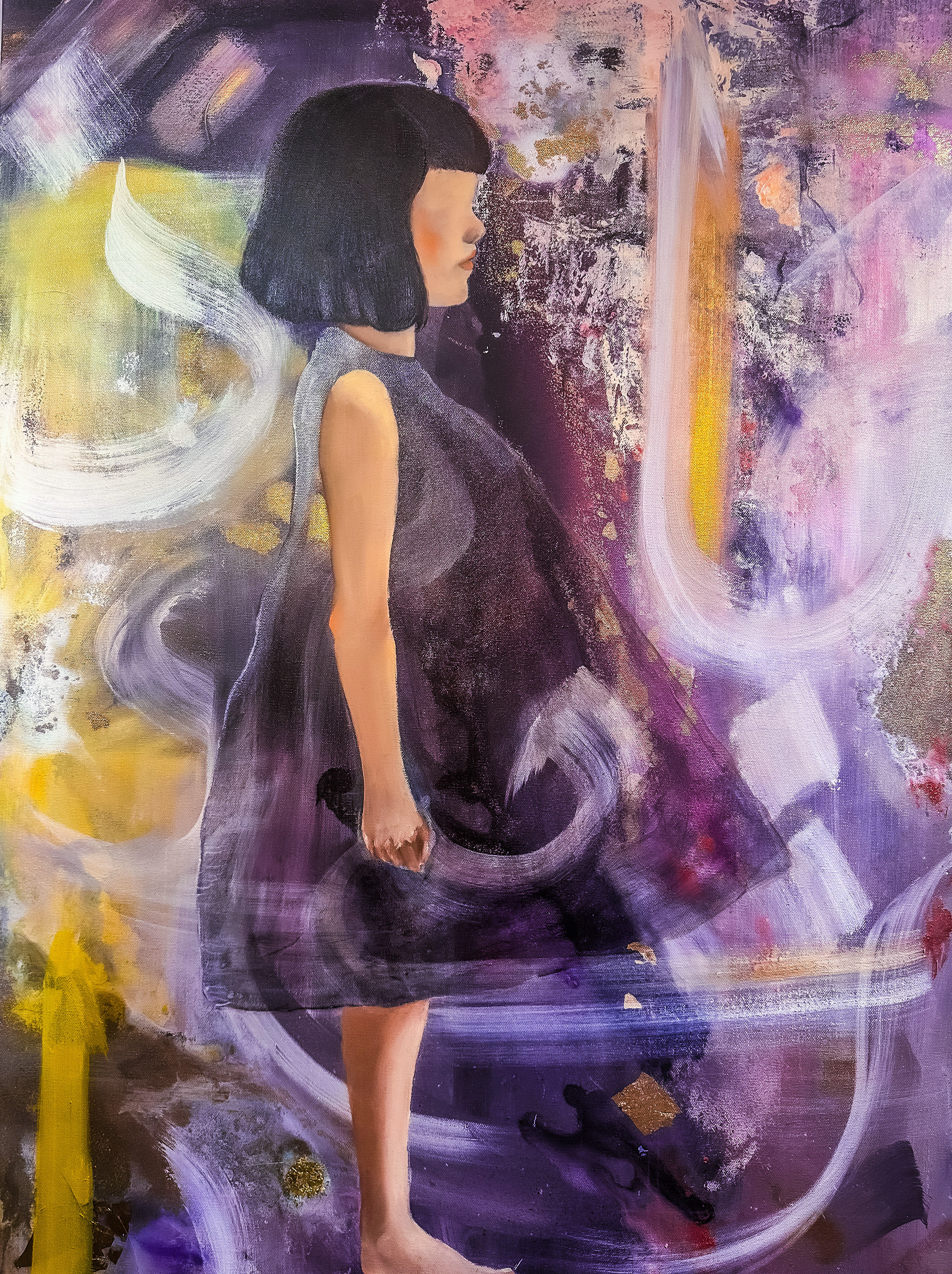 Fillette 60"x40" (2pieces) Mixed Media This artwork are a personal and introspective pieces, inspired by a portrait of the artist from her youth. The faceless figures, depicted from the shoulders up, reflects a memory or essence rather than a literal self-representation. The dark bob haircut, a defining feature, draws from the artist’s own image, capturing the simplicity and innocence of childhood or adolescence.