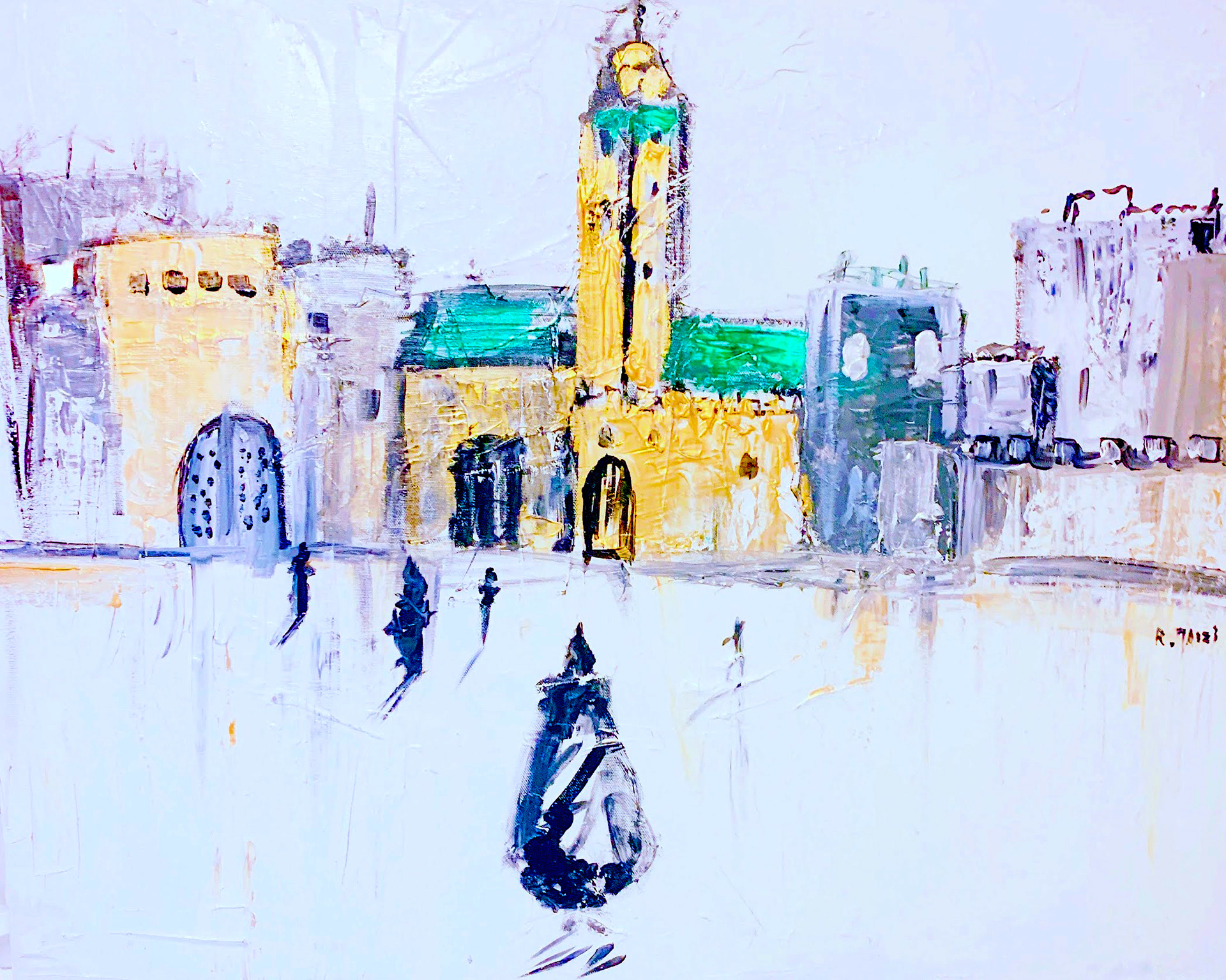 Veiled Identities 36"x48" Mixed Media. A tribute to Moroccan tradition, featuring figures in colorful djellabas with patterns and Arabic calligraphy.