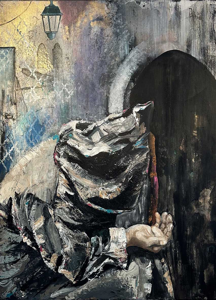 "No title Painting" 36"X48" Mixed Media . This piece captures a moment of quiet introspection, blending traditional Moroccan influences with modern portraiture.